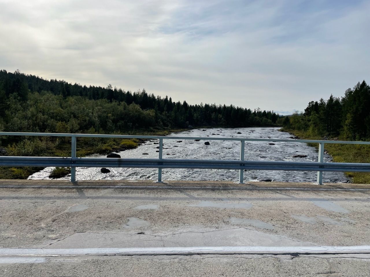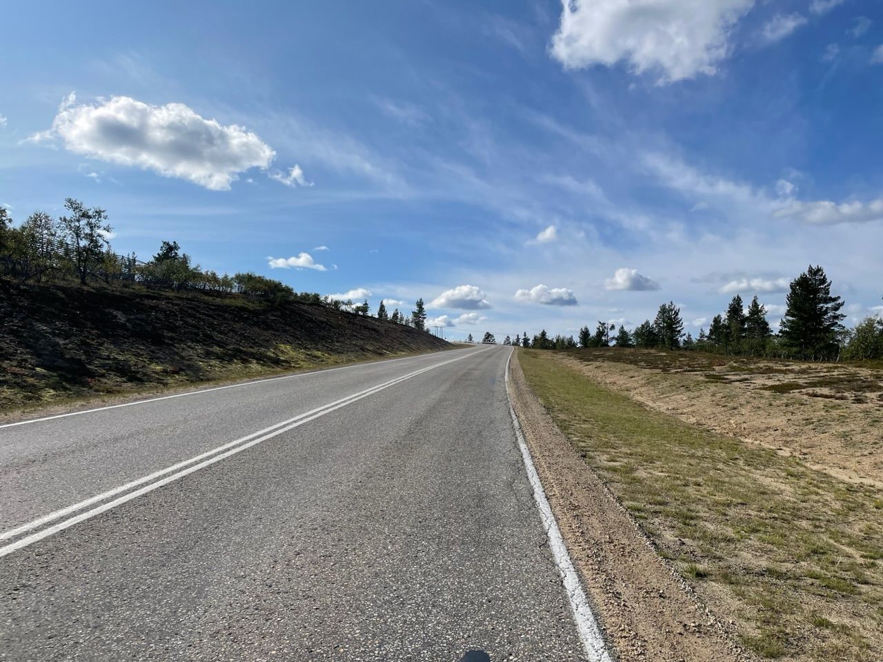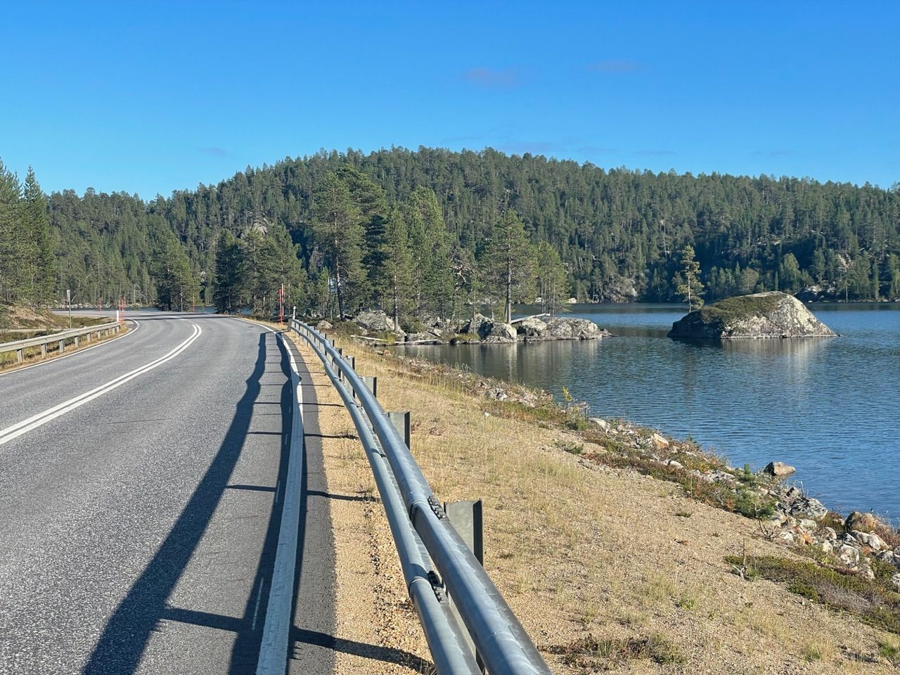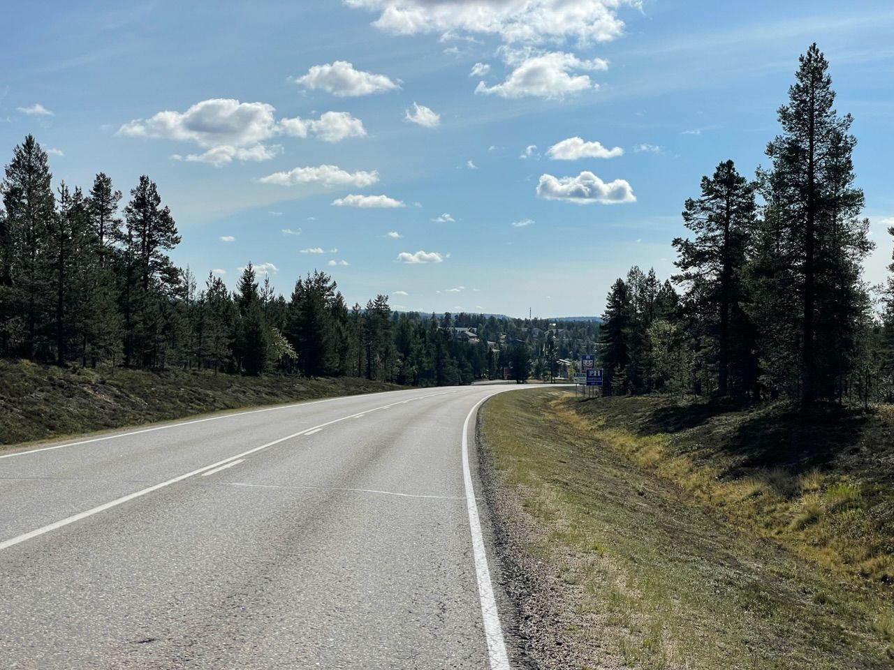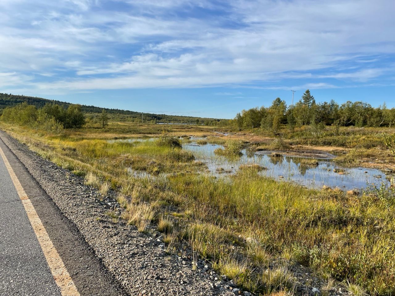 Next a steep climb with 10% incline, there's not much traffic so I can drive in a zig-zack line. From there on roads, straight into the barren forest. The vegetation in this colder and wet climate is different up here. Trees grow scars and not as tall, more birch and less pine trees, spaced out further apart with the long tundra grass in between. Swampland, lakes and rivers getting more and more frequent.