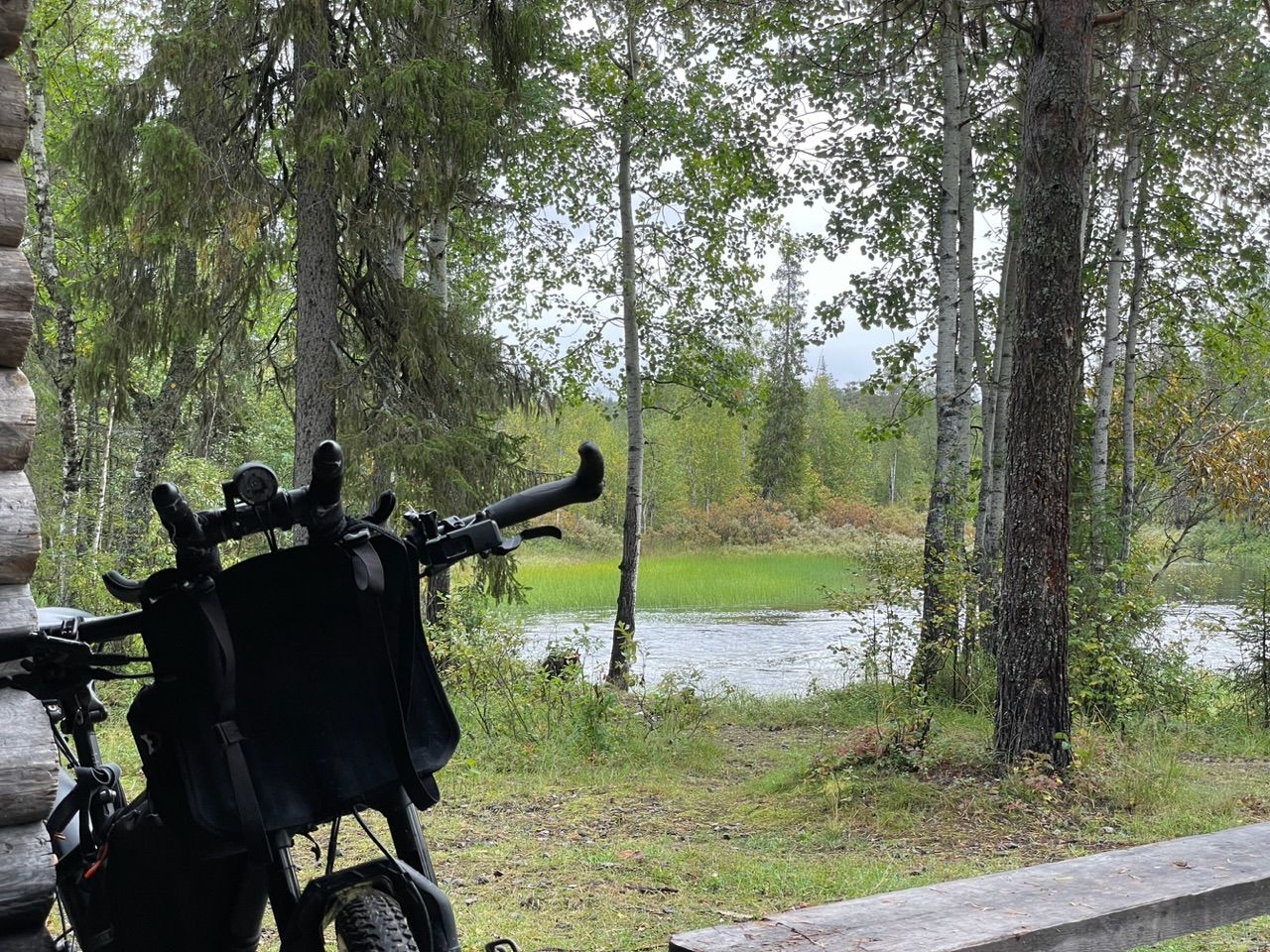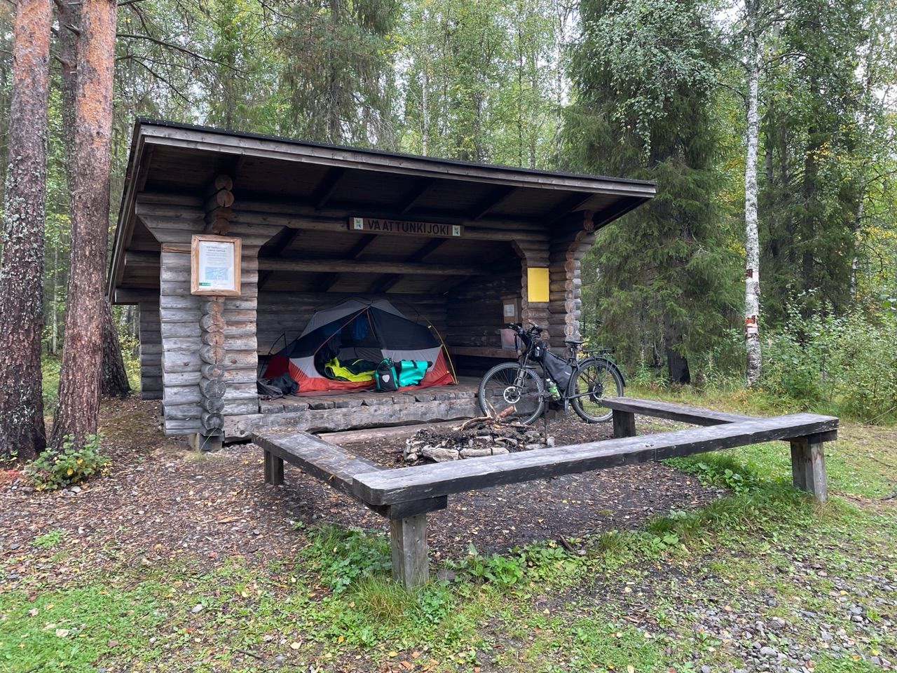 Cycling through the rain - have it in my face all the time. The "shared" bike lane with the highway, same as in Norway gets anoying, traffic is less but there are loads of busses and trucks and they do not always keep as much distance as I like. Stopped after 50km at the arctic circle nature reserve - a bigger network of hiking trails, shelters. Seems nice and found shelter there next to a river - I'll stay here for the night.