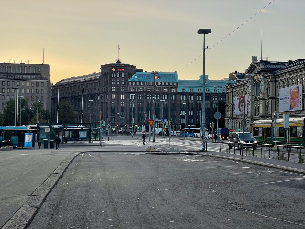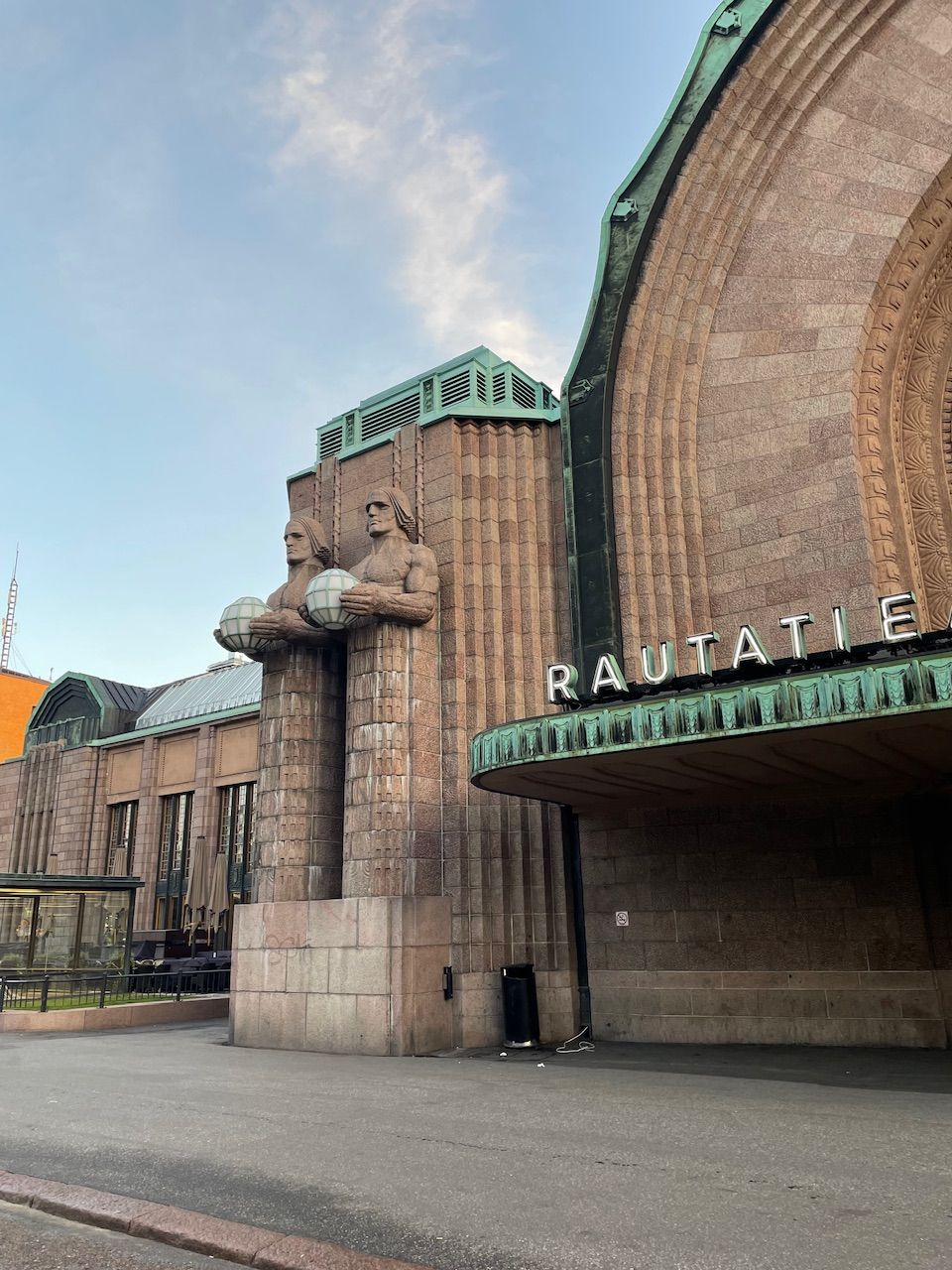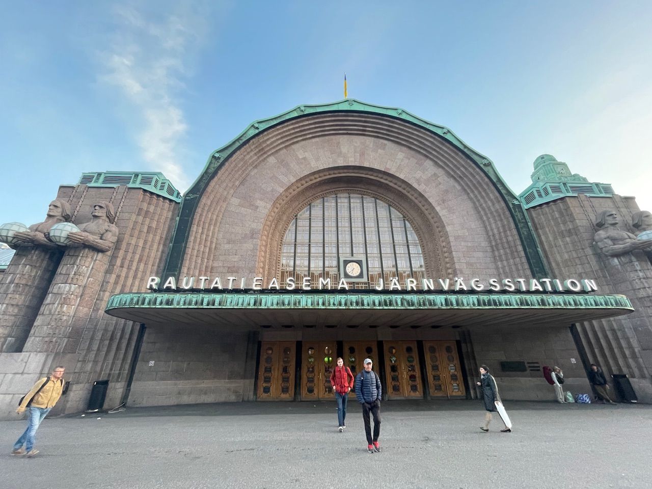 It is short before 07:00 and Helsinki is slowly waking up. The train hall reminded my of the train station in Milano - old well preserved and quite monumental. Entering the waiting hall your greeted by high sealings - more ball room the waiting hall. I push my bike out the exit, two large wooden doors and to ger my besrings I turn around. The entrance pf the train station is guardedby two huge stone sculptures a preview of the cities rich architecture.